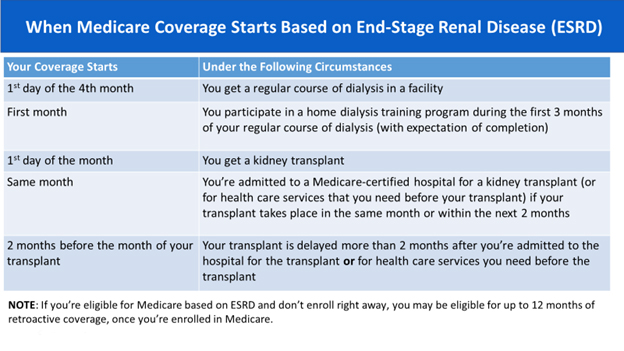 Before deciding to delay enrollment, an individual should get all the facts about ESRD Medicare eligibility and enrollment for their situation, especially if a transplant is planned as there are shortened time periods for eligibility and enrollment for transplant recipients.